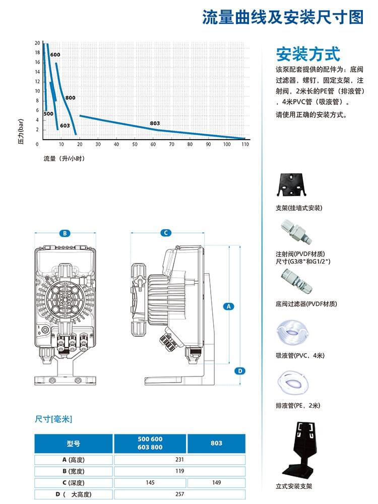 備注:完整的標準安裝配件包括:底閥過濾器及注射閥、PVC吸液管,PE排液管及固定支架。