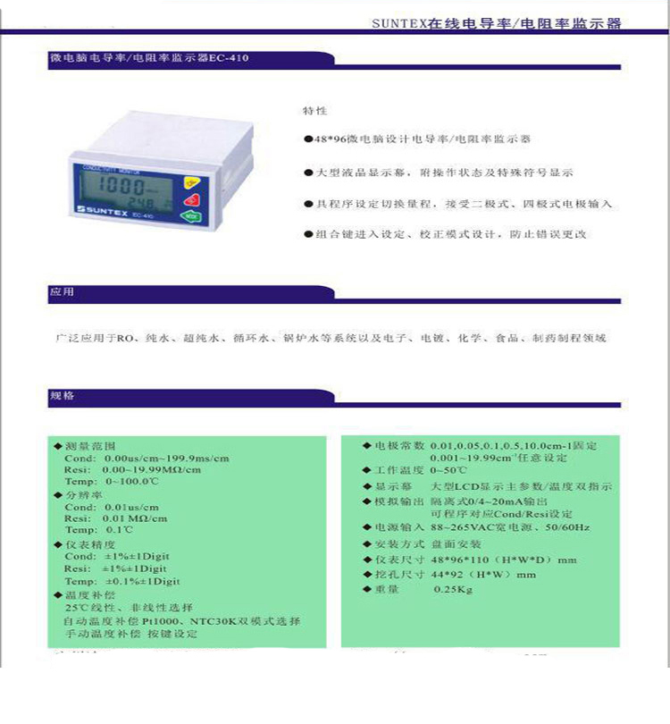 SUNTEX電導率儀EC-410水質監測電導率控制儀電阻率變送器