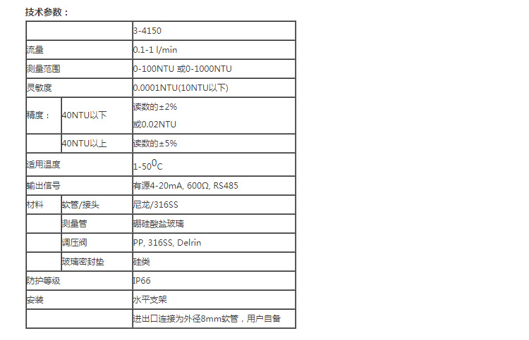 兩種量程可選。0 -100 NTU 型的用于低量程應用,如飲用水監(jiān)測。0 - 1000 NTU 型的可用于各種場合,如原水、廢水等。