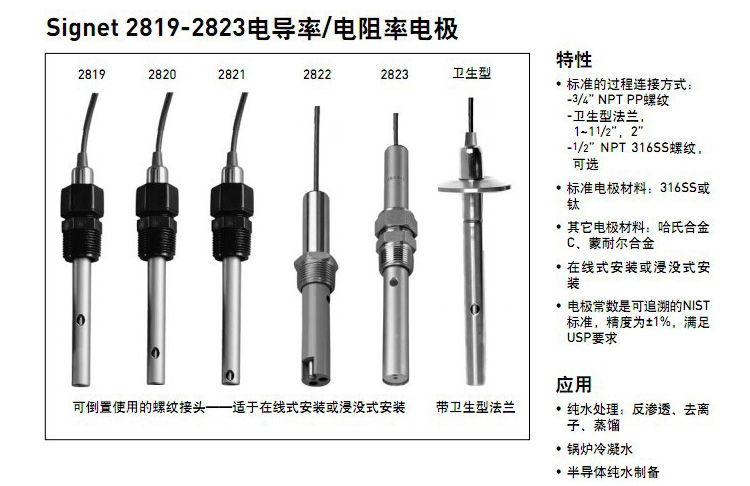 2819-2823電導率/電阻率電極可以采用多種安裝方式,能確保良好的準確度和重復性。標準材料為316不銹鋼或鈦,也可選用其他材料。可選用衛生型法蘭。電極中內置PT1000熱電阻,對溫度進行測量。