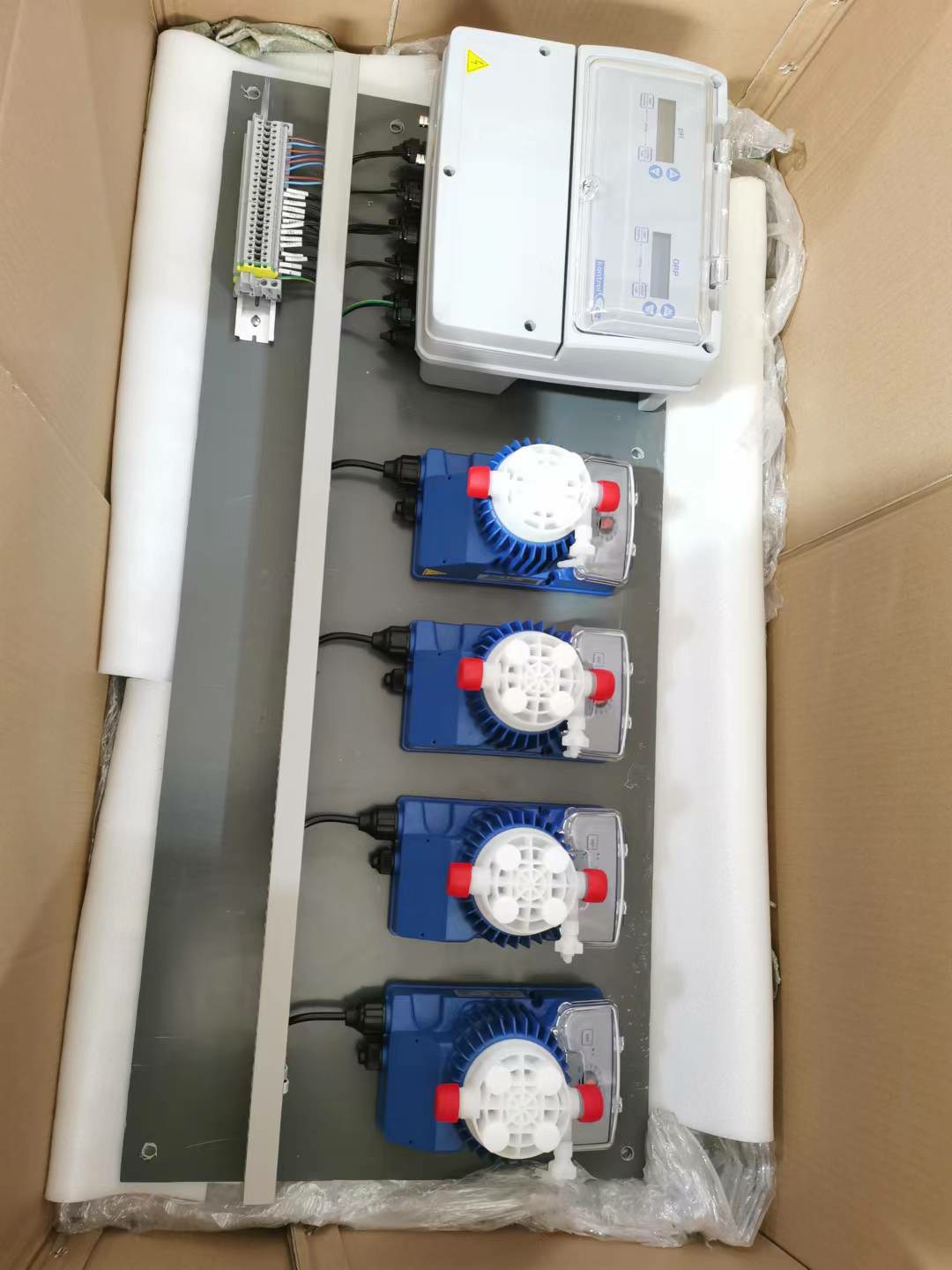三臺或者四臺加藥計(jì)量泵可選,投加絮凝劑計(jì)量泵, 加酸計(jì)量泵,加氯計(jì)量泵和除藻劑加藥泵。