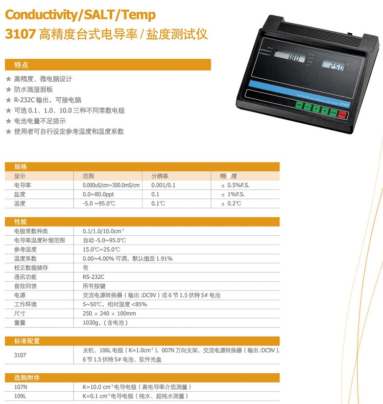 型號:電導率/鹽度計3107型 JENCO鹽度測試儀