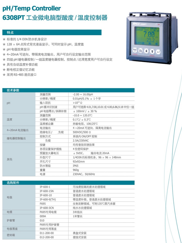 PH/溫度變送器6308PT 任氏/JENCO微電腦酸度氧化還原成套控制器
