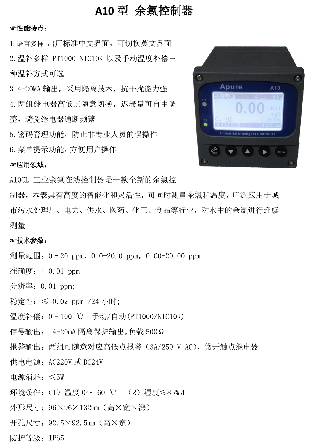 Apure愛(ài)普爾A10CL兩組繼電器工業(yè)在線余氯控制器一套含電極
