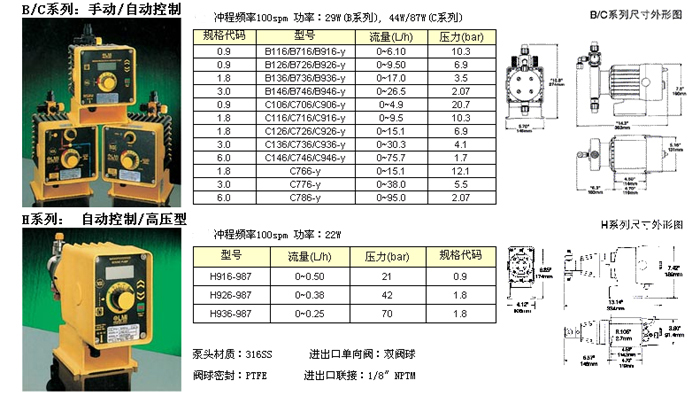 LMI電磁計量泵共有P, A, B, C, E, H, J5等7個系列。用戶可根據流量、壓力、防爆、