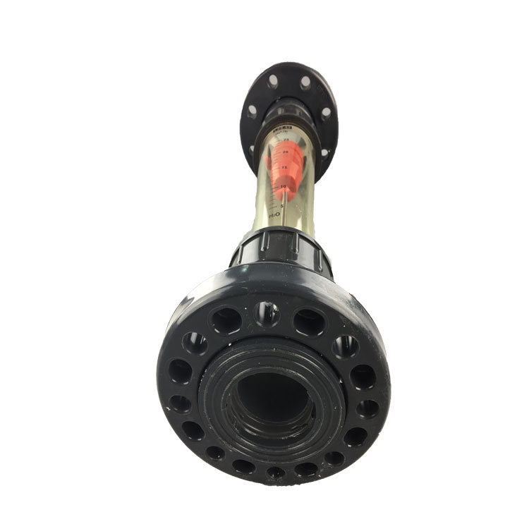 塑料流量計結構如圖:主要由小端向下,大端向上垂直安裝的透明塑料錐管和在錐管內可上下移動的浮子作為測量元件,與螺母、接管、止檔及“O”型圈等構成。當流體在錐管內自下而動時,在浮子上下產生壓差,使浮子上升,當此壓差與浮子重力、浮力及粘性力處于力平衡時,浮子處于靜止位置,當流量變化時,流經錐管與浮子間環隙處流體的流速變化,浮子上下的壓差相應變化,浮子作上下移動,因此浮子靜止位置的高度可作為流量的量度。