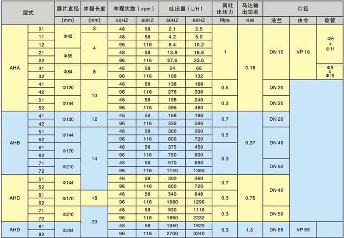 AH系列計量泵性能對照表