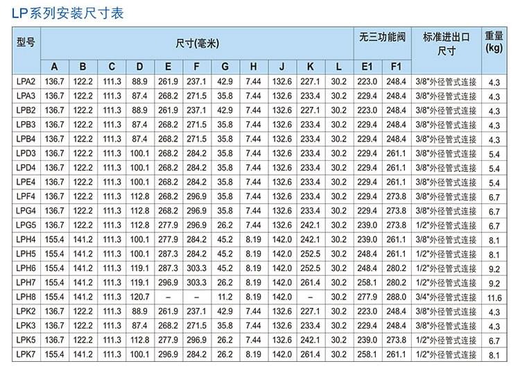 1/4"內徑×3/8"外徑,3/8"內徑×1/2"外徑,3/16"內徑×5/16"外徑,1/2"內徑×3/4"外徑(只用于LPH8)