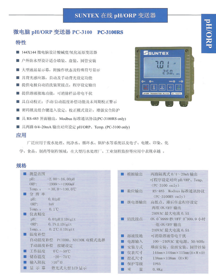 SUNTEX PH計PC-3100工業在線純水PH/ORP變送器配梅特勒405-60-SC電極