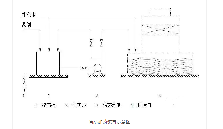 藥劑加入集水池中不要靠近排水口,以免藥劑不進(jìn)入循環(huán)水系統(tǒng)就被直接排走;藥劑在池中要有一個(gè)混合的時(shí)間,使其混合均勻;不要靠近某一臺(tái)泵的入口加藥,這樣會(huì)造成藥劑濃度分布不均勻。